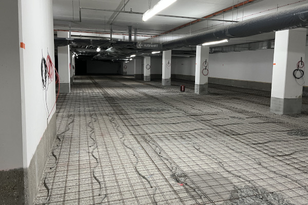 Die zweigeschossige Tiefgarage wurde in den 1950-er Jahren errichtet und verfügt auf ca. 1.900m² über 52 Stellplätze. Die Parkebenen sind mit einem PKW-Aufzug verbunden. Im Zuge der Instandsetzung wird nach Abbruch des Bodenaufbaus die Bodenplatte sowie die Zwischendecke mit kathodischem Korrosionsschutz (KKS) geschützt. Anschließend wird auf der Bodenplatte ein Oberflächenschutzsystem OS8 und auf der Zwischendecke sowie der Zufahrtsrampe ein OS11a appliziert.